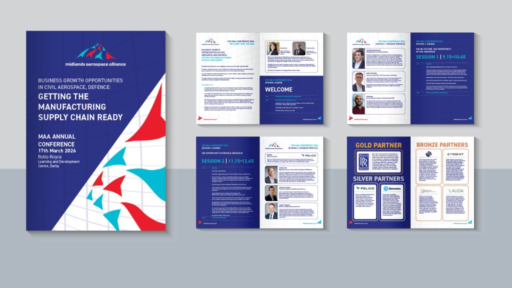 Building on our previous collaboration, the Midlands Aerospace Alliance invited me back to produce the core materials for their 2026 Conference. This project involved designing a comprehensive set of event brochures alongside a high-impact, backlit banner to ensure the brand and its Gold, Silver, and Bronze partners had a commanding presence throughout the venue.